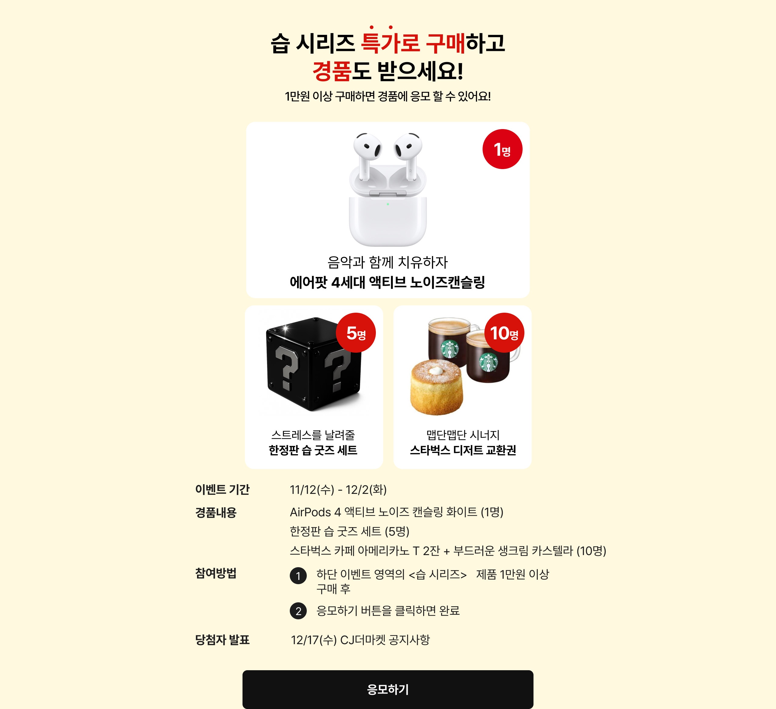 • 본 이벤트는 11/12(수)~12/2(화) 기획전 내 습 시리즈 제품 1만원 이상 구매하고 응모하기를 완료하신 고객을 대상으로 선정 됩니다.