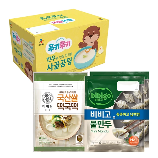 상품 상세 정보상품 코드 : 40222181상품이미지를 터치하면 자세히 확인하실 수 있어요.푸키루키 한우로 만든 건강한 사골곰탕 300x5개상품1) 푸키루키 한우로 만든 건강한 사골곰탕 300x5개상품2) 비비고 물만두 370g*2ea상품3) 미정당 국산쌀 떡국떡1kg 본 컨텐츠(제품 이미지, 텍스트, 상세페이지 등)의 저작권은 CJ제일제당에 있으며, 무단으로 복사/배포 시 저작권법에 의거 민/형사상 책임을 물을 수 있습니다. © CJ Cheiljedang Corp.